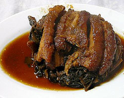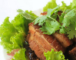 เคาหยก เป็นอาหารที่มีชื่อเสียงของเบตง ทำจากเนื้อหมูกับเผือก มีวิธีการปรุงที่พิถีพิถันสลับซับซ้อน โดยจะเริ่มจากการนำเนื้อหมู 3 ชั้นมาต้มให้สุก จากนั้นจึงนำขึ้นมาสะเด็ดน้ำในรังนึ่ง และใช้ช้อนส้อมจิ้มที่หนังหมูเพื่อให้น้ำมันไหลออกมา ทิ้งไว้สักพัก แล้วนำเกลือมาคลุกให้ทั่ว หลังจากนั้นนำไปทอดในน้ำมันที่เดือดปานกลาง จนสังเกตว่าหนังหมูเริ่มพอง แล้วจึงนำขึ้นมาสะเด็ดน้ำมัน และต่อด้วยการต้มอีกครั้ง เมื่อนำขึ้นจากหม้อต้มให้นำมาผ่านความเย็นทันที เพื่อเพิ่มความกรอบ จากนั้นนำมาหันเป็นชิ้นเล็ก ๆ หมักกับเครื่องยาจีน เพื่อเพิ่มคุณค่าทางอาหารให้ร่างกาย แล้วนำมาจัดวางสลับกับเผือกทอด แต่ก่อนที่จะรับประทานต้องนำไปนึ่งอีกครั้ง แล้วจีงโรยหน้าด้วยผักชี เพื่อดับกลิ่นคาว ข้อมูล http://th.wikipedia.org |