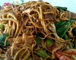 | หมี่เบตง เป็นอาหารขึ้นชื่อของเบตง มีคุณสมบัติพิเศษ คือเส้นเหนียวนุ่ม เมื่อนำไปผัดเส้นจะไม่ขาด ทำให้ผู้ที่ได้รับประทานติดใจในความเหนียวนุ่มของเส้นหมี่ หมี่เบตงมี 2 ชนิด คือ หมี่สีเหลืองเหมือนหมี่ทั่วไป ที่จะต้องนำไปนึ่งให้สุกแล้วนำมาจับเป็นก้อน เอาไปผึ่งแดดแล้วบรรจุลงถุง ส่วนหมี่ซั่วนั้นมีเส้นสีขาว ซึ่งต่างกันที่หมี่ซั่วนั้นไม่ต้องนึ่ง แต่นำไปตากแดดแทน ส่วนซีอิ๊วเบตง ซีอิ๊วที่มีรสชาติเป็นเอกลักษณ์ที่ไม่เหมือนใครนั้น ก็มีกรรมวิธีในการทำสลับซับซ้อน และใช้เวลานานทีเดียว โดยกว่าจะได้ซีอิ๊วน้ำหนึ่งก็ต้องหมักประมาณ 3 เดือน และถ้าต้องการซีอิ๊วน้ำสองก็ต้องใส่น้ำเกลือหมักต่ออีกอย่างน้อย 15 วัน แต่ถ้าต้องการซีอิ๊วดำต้องหมักทิ้งไว้ถึง 6 เดือน แล้วนำน้ำซีอิ๊วที่ได้ไปต้มจนเดือด จะทำให้น้ำซีอิ๊วเปลี่ยนเป็นสีดำเองโดยธรรมชาติ ข้อมูล http://th.wikipedia.org | |