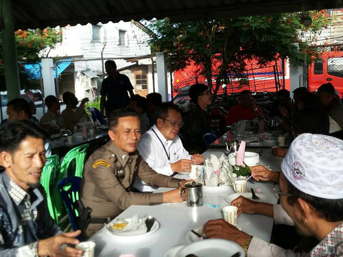 นายนิมูหะมัดนูรดิน แว วิศวกรระดับ 9 กองโรงไฟฟ้าเขื่อนบางลาง นายสฤษดิ์ ศรีอินทร์ ผู้ช่วยหัวหน้าโครงการปรับปรุงโรงไฟฟ้าพลังน้ำเขื่อนบางลาง เครื่องที่ 1-3 (ช.หก-ปล.) ร่วมกิจกรรมจิบน้ำชายามเช้า เพื่อพบปะหารือ แลกเปลี่ยนความคิดเห็น แนวทางการดำเนินงานของหน่วยงานราชการ กับผู้นำท้องถิ่น ผู้นำศาสนา ในการแก้ไขปัญหาความเดือดร้อนของประชาชนในเขตพื้นที่บันนังสตา ณ สถานีตำรวจภูธรบันนังสตา อำเภอบันนังสตา จังหวัดยะลา เมื่อวันที่ 21 กรกฎาคม 2559 |