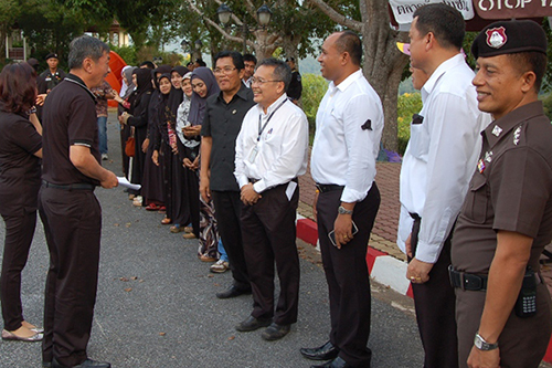 นายนิมูหะมัดนูรดิน แว วิศวกรระดับ 9 กองโรงไฟฟ้าเขื่อนบางลาง นายสฤษดิ์ ศรีอินทร์ ผู้ช่วยหัวหน้าโครงการปรับปรุงโรงไฟฟ้าพลังน้ำเขื่อนบางลาง เครื่องที่ 1-3 (ช.หก-ปล.) พร้อมด้วยผู้ปฏิบัติงานฯ ร่วมต้อนรับนายดลเดช พัฒนรัฐ ผู้ว่าราชการจังหวัดยะลา พร้อมคณะ และนายอัมรินทร์ นิติพล นักแสดงและพิธีกรพร้อมคณะ เพื่อถ่ายทำรายการสารคดีเชิงท่องเที่ยว “ตามรอยเท้าพ่อ” ในพื้นที่จังหวัดยะลาและบริเวณเขื่อนบางลาง ซึ่งพระบาทสมเด็จพระปรมินทรมหาภูมิพลอดุลยเดช เคยเสด็จเยี่ยมเขื่อนบางลางหลายครั้ง ณ เขื่อนบางลาง อำเภอบันนังสตา จังหวัดยะลา เมื่อวันที่ 24 พฤศจิกายน 2559 |